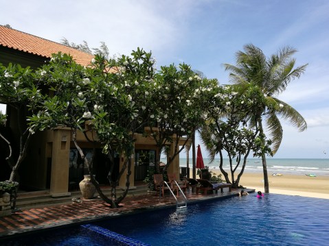ต้องขอบคุณภรรยาผู้เตรียมการทุกอย่างรวมถึงการเลือกและจองที่พักด้วย เหตุผลที่เลือกที่นี่ก็คือ ที่นี่สวยและน่าลอง มีสระว่ายน้ำ มีหาดทราย มีทะเลสวย เพราะประสบการณ์เรื่องหาดทรายที่ปราณบุรีเราไม่ค่อยดีนัก เคยไปพักที่อื่นแล้วไม่มีหาดให้เล่น ต้องเดินข้ามถนนเพื่อไปเจอทะเลริมทางเดิน ไร้หาดทราย รอบนี้ก็เลยเลือกให้รอบคอบหน่อย