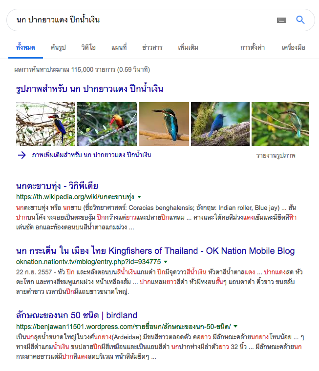 อยู่ๆก็มีนกบินชนกระจกแล้วตกลงมาในสนามหญ้า ผมกับลูกเข้าไปดูใกล้ๆเห็นบาดเจ็บอยู่ นกสีสันสวยงาม ตัวใหญ่ ท่าทางเจ็บหนัก เลยถือโอกาสสอนลูกให้หาคำตอบจากอินเทอเน็ตว่านกชนิดนี้คือนกอะไร ให้ลูกใช้เสียงค้นหาจาก smart tv โดยเข้าอินเทอเน็ตหาข้อมูลโดยพูดว่า นก ปากยาวแดง ปีกน้ำเงิน ทีวีแสดงผลการค้นหามาชุดหนึ่ง ดูรูปก็พบว่ามันคือ กระเต็นใหญ่ธรรมดา (Stork-billed Kingfisher): Pelargopsis capensis