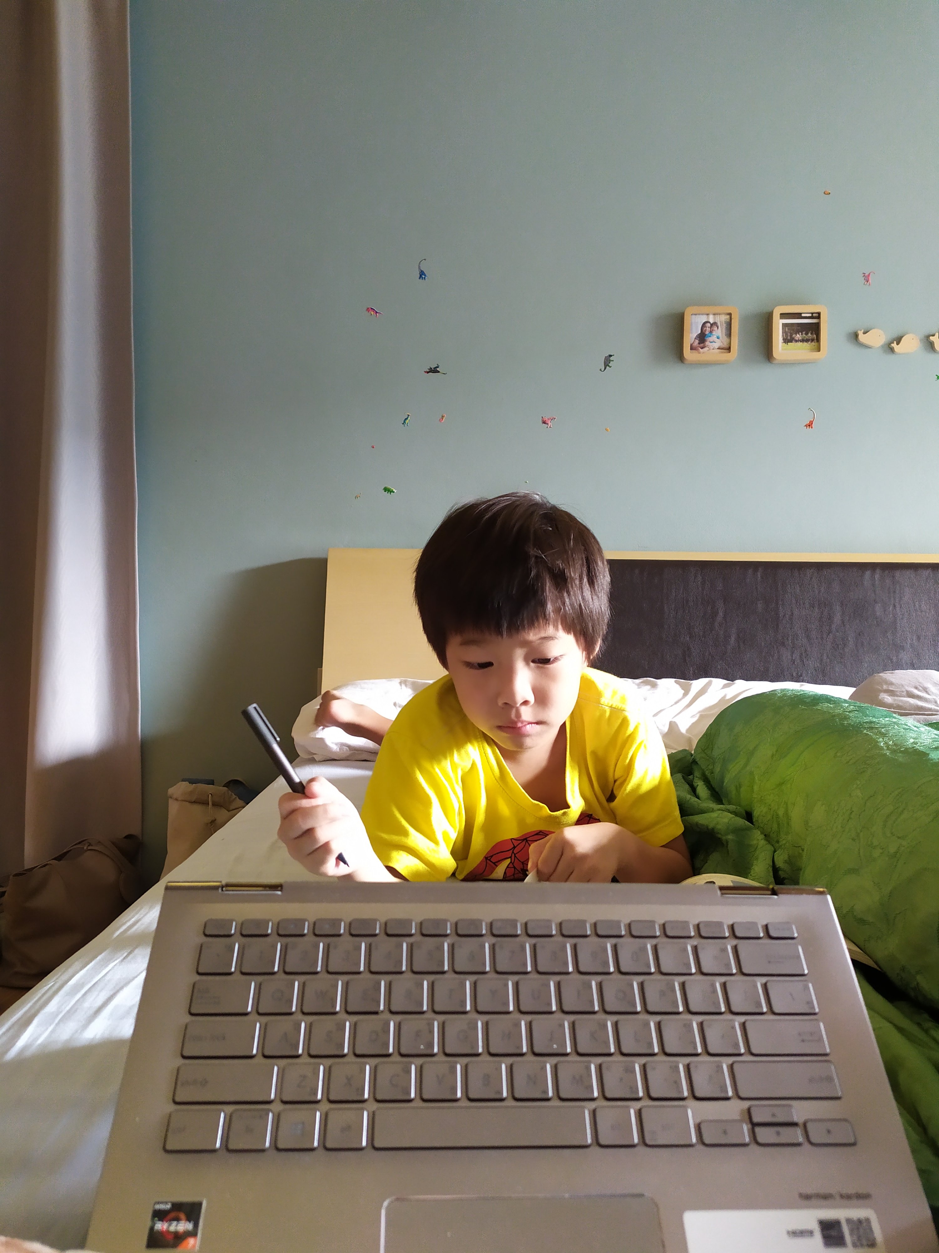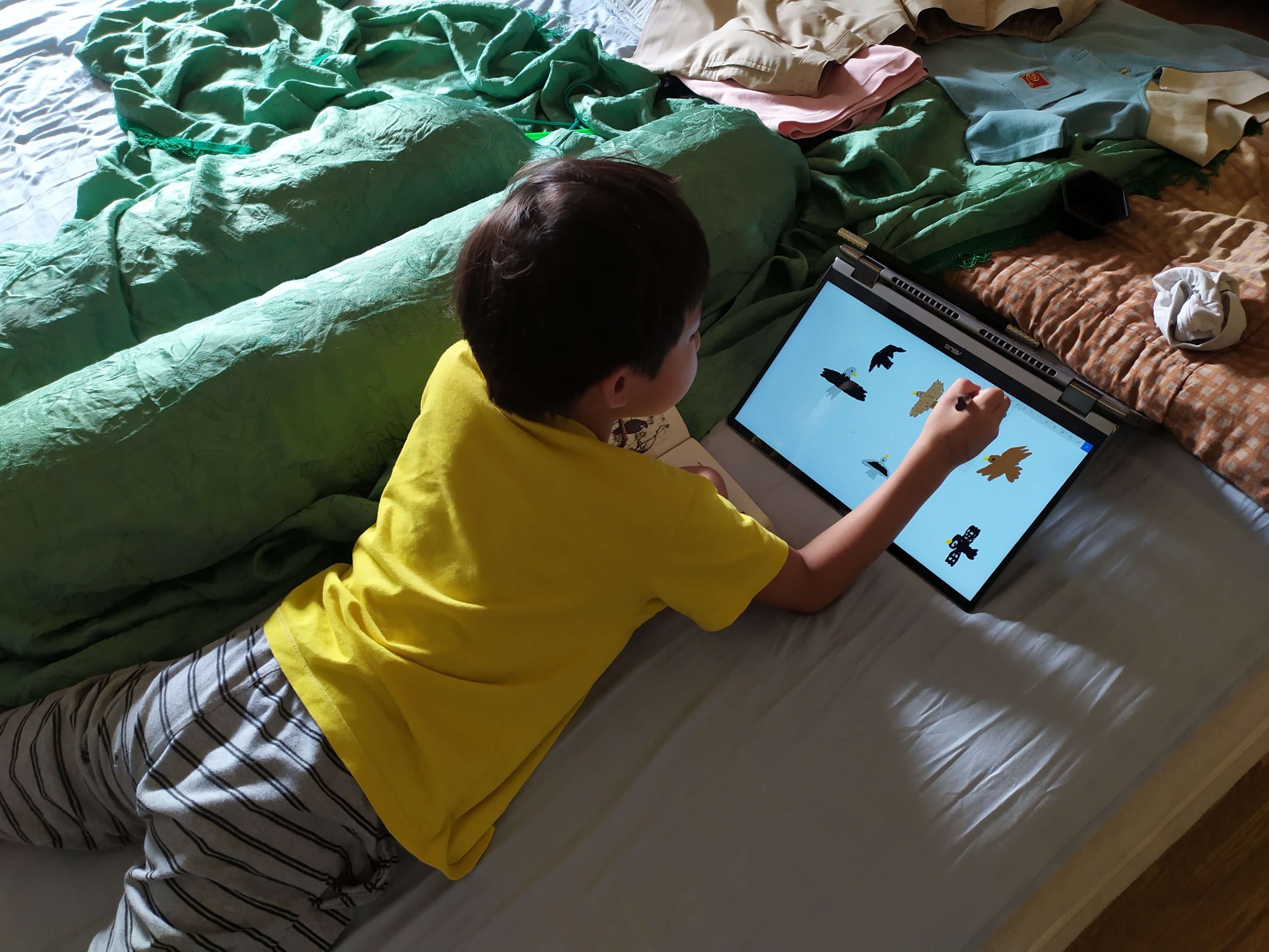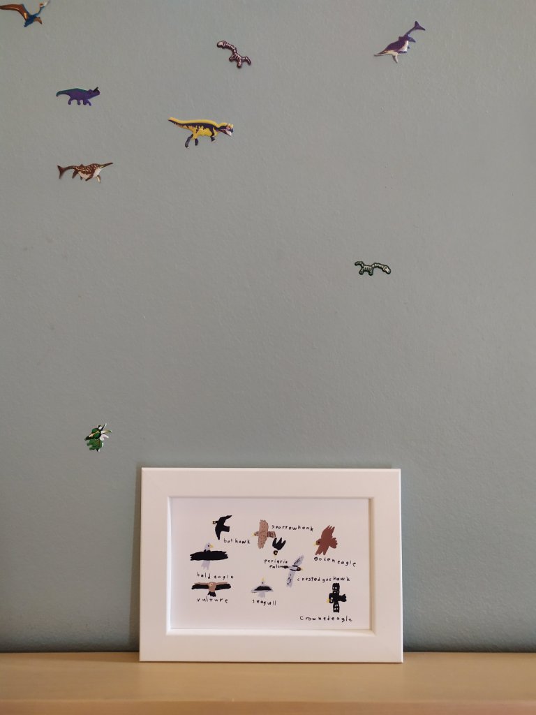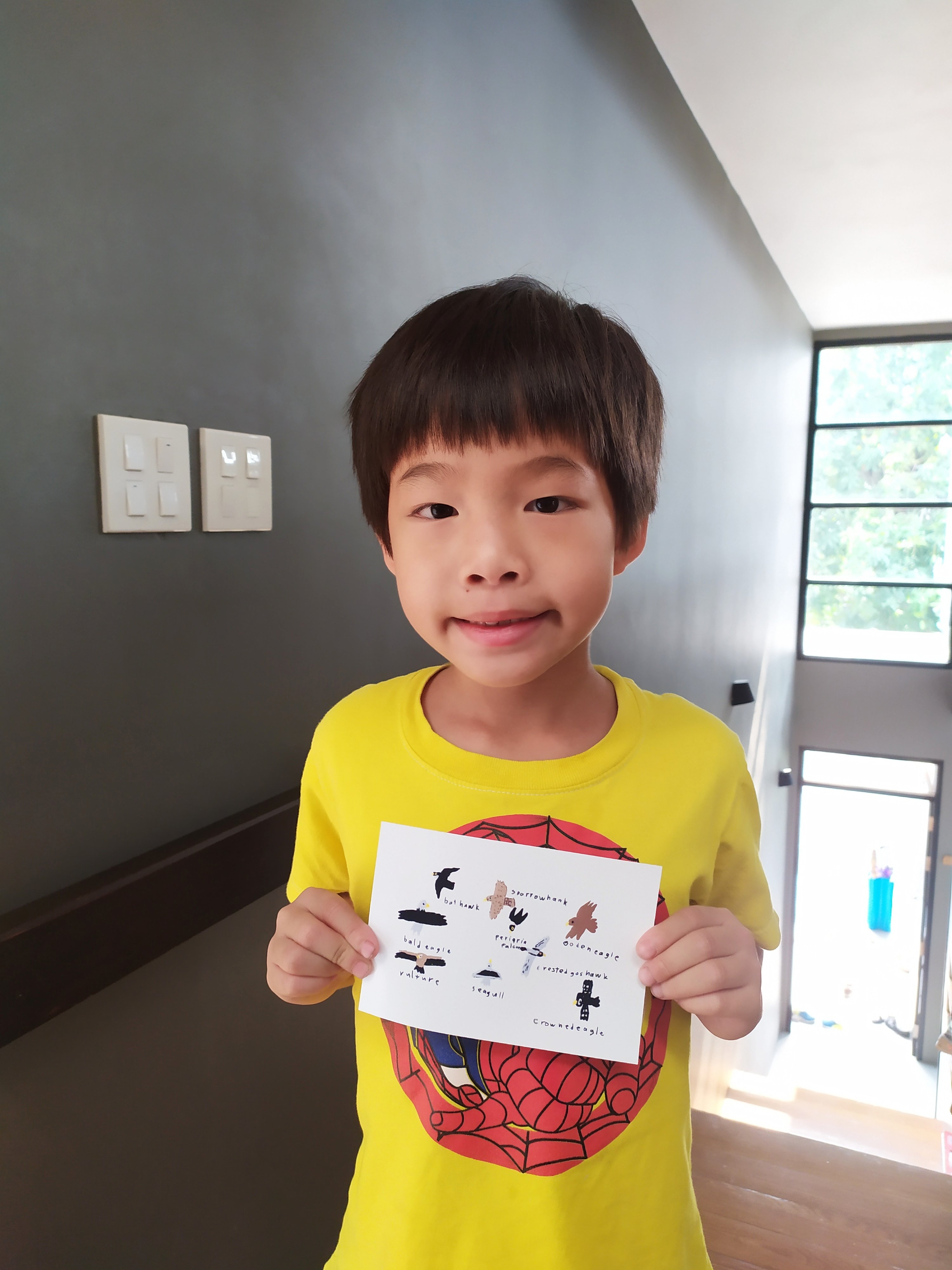 ขอบฟ้าชอบเรื่องเหยี่ยวและนกนักล่าต่างๆมาก จากการดูคลิป ดูหนังสือภาพ ก็เริ่มวาดภาพนกมาหลายเดือน งานส่งครูที่โรงเรียนก็ทำเรื่องเหยี่ยว ช่วงนี้เลยมีผลงานออกมาเป็นภาพวาด ตอนวาดเล่นก็ไม่ได้คิดว่าจะจบออกมาเป็นกรอบรูปแบบนี้ แต่ภาพที่วาดมันดูเหมาะกับกรอบสีขาวมาก เลยแนะนำให้ทำจบแบบนี้เลย