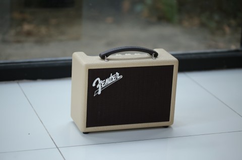 ตะแกรงด้านหน้าเข้าใจว่าเป็นพลาสติก แต่ทำสีให้ดูมันวาวเป็นสีทองอ่อนๆ ต้องได้มุมสะท้อนแสงที่พอดีจะเห็นความวาวสวยงามของสีที่เลือกทำมา ตัวหนังสือ Fender ดูโดดเด่นเป็นเอกลักษณ์มาก เป็นการออกแบบลำโพงที่สวยที่สุดตัวหนึ่งที่เคยเห็น มันทำให้ลำโพงเป็นของแต่งบ้านได้ไปในตัวเลย ยกไปวางตรงไหนก็ดูน่ารักน่ามอง